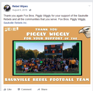 Everyone who saw the banner felt great about the about the store and rebel wipes; this includes families of the players but also everyone else who shops there. You can also take into consideration how the employees felt about their employer and its community support. The store manager even sent a copy to the Fox brothers, who own the grocery, at the Piggly Wiggly head office. Gratitude was contagious!